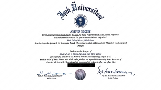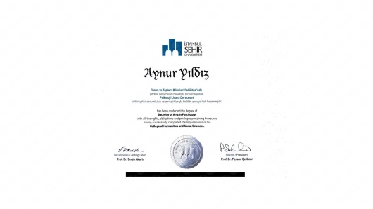 Uzm. Kl. Psk. Aynur Yıldız, lisans eğitimini İstanbul Şehir Üniversitesi'nde Psikoloji bölümünde almış olup Işık Üniversitesi'nde yüksek lisansını Klinik Psikoloji üzerine yapmıştır. Şu anda online ve yüzyüze olarak hizmet vermektedir. İngilizce ve Arapça bilmektedir. Terapi Yaklaşımları: Dissosiyatif Bozuklukların Tedavisinde EMDR Uygulamaları – DBE – 42 saat Pozitif ve Kültürlerarası Psikoterapi İleri Düzey Eğitimi - Gülşen Varlıklı – Devam etmekte Pozitif ve Kültürlerarası Psikoterapi Temel Düzey Eğitimi – Gülşen Varlıklı – 200 sa Duygu Odaklı Çift Terapisi Eğitimi – BETED – 72 saVaroluşçu Analiz - Logoterapi Eğitimi - Victor Frankl Enstitüsü Türkiye Dinamik Psikoterapi Temel Eğitimi - Doğan Şahin - 40 saat Uluslararası Şema Terapi Eğitimi - Gonca Soygüt - 50 saat Kumar Bağımlılığına Yaklaşım Eğitimi - 9 sa Bağımlılığa Yaklaşım Eğitimi -12 sa Kriz, Travma, Yas ve Ölüm Psikoterapisi Eğitimi - 18 Sa Motivasyonel Görüşme Teknikleri Eğitimi - 12 sa Bütüncül Rüya Eğitimi - 72 sa Aktarım Odaklı Psikoterapi - Psikoterapi Enstitüsü - 72 Saat Süresi Sınırlı Dinamik Psikoterapi ‐ Psikoterapi Enstitüsü ‐ 72 Saat EMDR 1-2.Düzey ‐ Davranış Bilimleri Enstitüsü ‐ 80 Saat Psikanalitik Psikoterapi Masterson Yaklaşımı Eğitimi ‐ Psikoterapi Enstitüsü ‐ 72 Saat APAMER ‑ Dr. Nevin Dölek ‑ Kısa Süreli Çözüm Odaklı Terapi Eğitimi ‑ 16 Saat Psikoterapi Enstitüsü ‑ Bütüncül Psikoterapi Eğitimi Teorik‑Formülasyon‑Süpervizyon Aşaması ‑ 864 Saat ‑ Kocaeli 10/10/2021 "Hayal mi Gerçek mi? Psikoterapide Rüyalarla Çalışmak" Sempozyumu (Düzenleme Kurulu Başkanı) ‑ İstanbul 09/2021 Psikoterapi Enstitüsü ‑ 5. Ulusal Bütüncül Psikoterapi Kongresi "Kaotik Yapılar ve Alan Teorisi" (Düzenleme Kurulu Üyesi) ‑ Kocaeli Aile Danışmanlığı ‑ Milli Eğitim Bakanlığı (MEB) ‑ 464 Saat ‑ Ankara 06/2021 Society for the Exploration of Psychotherapy Integration (SEPI) 37. Yıllık Toplantısı ‑ "Emotion Regulation in the Body" ‑ (Sözlü Bildiri) 09/2020 Psikoterapi Enstitüsü ‑ 4. Ulusal Bütüncül Psikoterapi Kongresi "Psikoterapide Öznellik" (Düzenleme Kurulu Üyesi) ‑ Kocaeli CİSED ‑ Bütüncül Çocuk ve Ergen Psikoterapisi Eğitimi ‑ 320 Saat ‑ İstanbul CİSED ‑ Çocuk Testleri Uygulama Yorumlama ve Rapor Yazma Eğitimi ‑ 30 Saat ‑ İstanbul Dulwich Center&POEM ‑ Narrative Terapi Eğitimi (1‑2‑3-4. Modül) ‑ 120 Saat ‑ İstanbul Moodist Academi‑ Yetişkin Testleri Uygulayıcı Eğitimi ‑ İstanbul